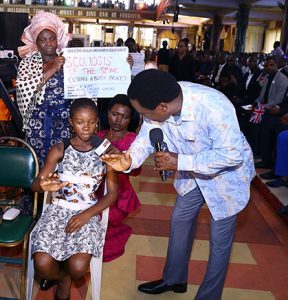 Mettant le message directement en pratique, le Prophète T.B. Joshua entra au milieu de la congrégation et déchaîna la puissance de Dieu sur la scène dans le nom puissant de Jésus-Christ. Il a rencontré une jeune fille de 12 ans assise avec un corset entourant sa petite taille. En compagnie de ses parents, Melle Favor Okere a demandé de l’aide. Encourageant sa foi pour un miracle, le prophète l’a instruite à prier: « Je fonce pour Te toucher, Seigneur Guéris-moi, au nom de Jésus! » Alors, avec juste un tapotement, elle se tint debout sur ses pieds en se débarrassant de son corset et marchant librement, guérie à la gloire de Dieu. Au moment où elle se rendit compte de sa guérison, son visage changea et la jeune fille courut en criant: «Merci, Jésus!» La puissance de Dieu a continué à se manifester pendant que le Prophète T.B. Joshua continuait à traverser la foule. La preuve de cette puissance de Jésus-Christ est présentée dans l’abondance des témoignages ci-dessous.