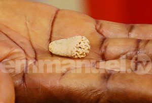 Confinée dans un coin étroit de son choix et ne voulant pas offenser ses enfants, Mme Atsu-Arop a crié à Dieu, lui demandant d’effectuer lui-même la chirurgie si cela devenait une option inévitable. Cette nuit-là, elle a utilisé l’Eau du Matin et s’est endormie. Vers minuit, elle s’est réveillée pour découvrir qu’un objet était coincé dans sa gorge. Utilisant son doigt, elle sortit une pierre de sa bouche. A Dieu soit la gloire, cette pierre était l’objet même que les médecins voulaient enlever chirurgicalement.