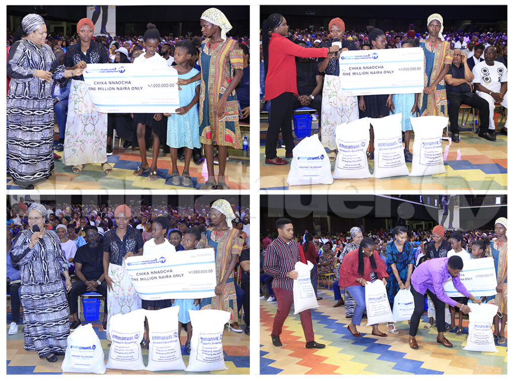 A principios de año, la Sra. Nnaocha había sentido el puro poder de Dios en la Arena de la Libertad durante la sesión de Imposición de Manos del Servicio Dominical de La SCOAN. En aquella ocasión, el demonio en la Sra. Nnaocha confesó que era el ídolo de la casa de su padre y que tenía la única misión de hacerla inútil en la vida. Como parte de esa misión, el demonio hizo que la mujer cayera en manos de un hombre quien a fuerza la convirtió en esclava sexual, aunque ella sólo había ido a trabajar para él como ama de llaves después de la muerte de su esposa. Durante ocho años, este hombre abusó de la indefensa mujer en todos los sentidos, llegando a tener tres hijos con ella. Al escuchar la historia de la señora Nnaocha, la Pastora Evelyn Joshua y algunos Socios de Emmanuel TV se sintieron movidos a ofrecer ayuda. Así, durante el servicio del 12 de marzo del 2023, la iglesia entregó un cheque de un millón de nairas a la Sra. Nnaocha, junto con tres sacos de arroz y una cesta. Con lágrimas de gozo en los ojos, Nnaocha dio las gracias a la Pastora Evelyn Joshua y a los Socios de Emmanuel TV de todo el mundo.