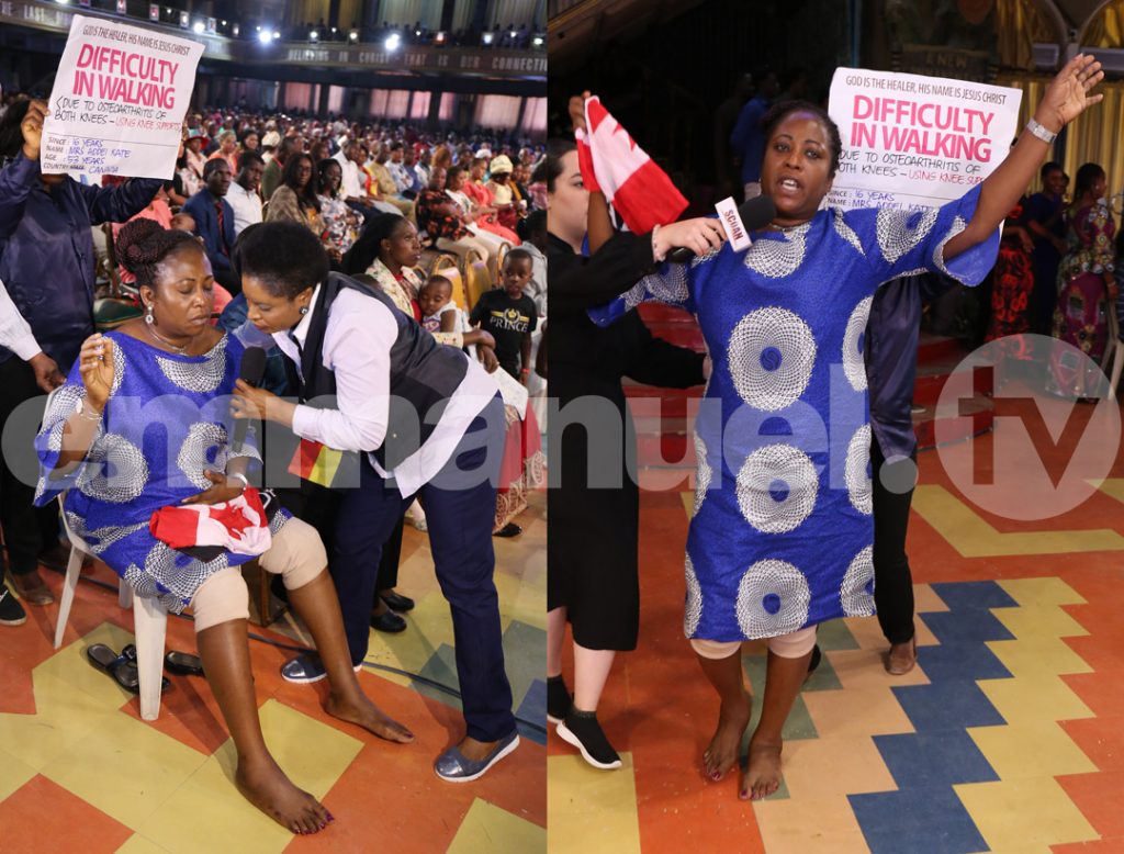 Durante 16 anos, Kate Addei, uma ganense de 53 anos, residente no Canadá, apresentava dificuldade em caminhar devido à osteoartrite de ambos os joelhos. Nos últimos 13 anos, ela estava no programa canadense de incapacidade devido à sua inaptidão de trabalhar. Nos últimos 12 anos, ela teve que deixar o Canadá para o Gana durante as temporadas que não são de verão. Se ela esperava fazer algum movimento, tinha que confiar na bengala. E depois de ficar um tempo sentada, ela não ousava se levantar e andar imediatamente; caso contrário, ela cairia. Inútil dizer que a condição a impedia de fazer as tarefas domésticas; ela precisava contar com os filhos para obter ajuda. Cansada de sua condição, ela buscou a Deus enquanto adorava na SCOAN.