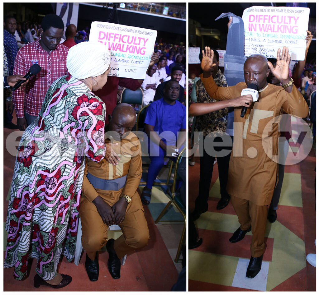 “Foi muito ruim”, disse Azuka em referência à dor que vinha sofrendo com a dificuldade de andar. “Eu não desejaria isso ao meu inimigo”, acrescentou. Declarando-se livre de dor, ele descartou suas duas joelheiras e demonstrou sua cura andando sem qualquer ajuda.