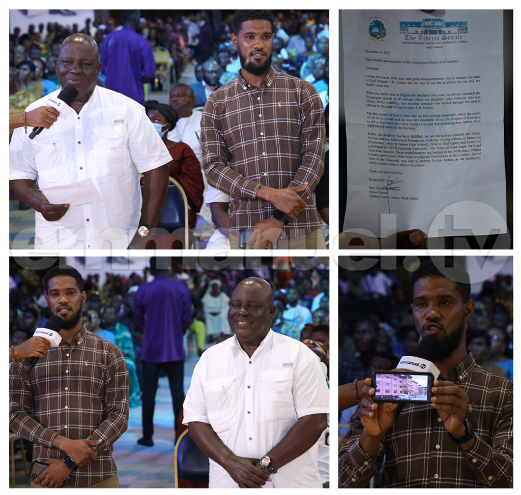 Jerome, da Libéria, chefe de gabinete do senador Yormie Johnson, leu uma carta do principal político liberiano. O senador Johnson veio para a Nigéria logo após a guerra civil da Libéria, na qual desempenhou um papel importante – e ficou lá pelos 14 anos seguintes. Durante esse tempo, ele era um visitante regular da SCOAN, onde recebeu palavras proféticas do Profeta TB Joshua, assegurando-lhe que as coisas acabariam dando certo para ele e sua família. Como o homem de Deus havia profetizado, o senador Yormie Johnson e sua família agora testemunharam um novo amanhecer, após o cumprimento de todas as profecias dadas pelo homem de Deus. Agora a família é proprietária orgulhosa de negócios legítimos que são uma bênção para a vida de muitos no País da Libéria. Jerônimo aconselhou as pessoas a esperarem pacientemente pelo cumprimento da promessa de Deus para suas vidas. Gideon, filho do senador Yormie Johnson, também falou sobre a cura de sua irmã após a oração do profeta TB Joshua durante o exílio de Johnson na Nigéria. Jerome terminou expressando os bons votos de seu diretor para a Pastora Evelyn Joshua e os Ministérios TB Joshua.