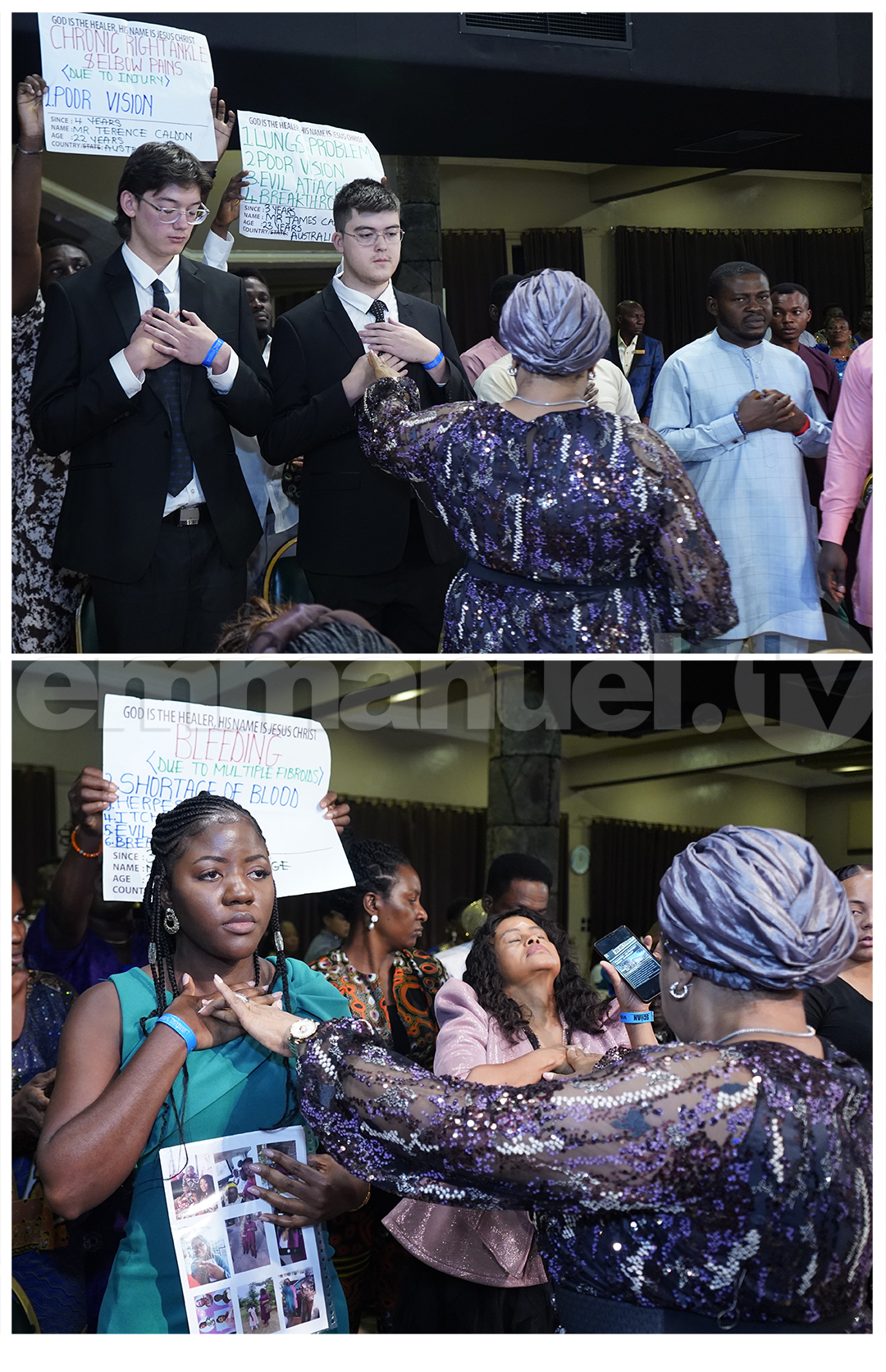 Antes de ministrar aos que estavam na Linha de Oração, a Pastora Evelyn Joshua orou ao Deus Todo-Poderoso: “Pai, deixe Seu poder de cura e libertação cair sobre Seus filhos, em nome de Jesus Cristo!”